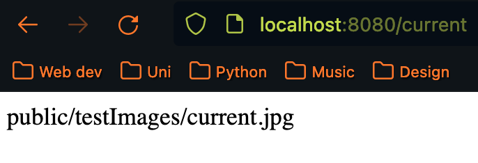 I wasn’t sure if this would be sufficient for the final version but I thought a hack solution could be to have the node app constantly updating the names of files as they enter the images dir. Whilst an image is the newest it could be called current.jpg, as soon as a new one is entered, the previous ‘current’ would simply be renamed to the current datetime. I thought maybe if this was done as images are constantly pumped in, this could be fast enough for my purposes.